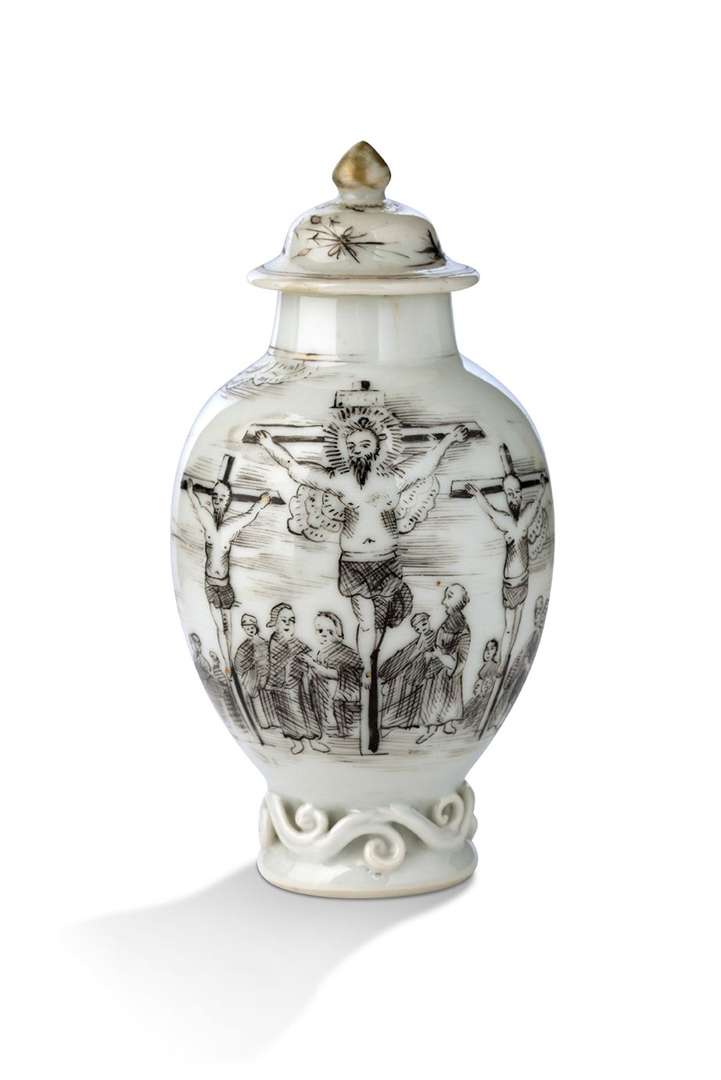 En porcelaine à décor en grisaille et rehauts d'or représentant la Crucifixion. Le Christ, au centre, encadré par les deux voleurs tandis qu'une foule de badauds se presse à leur pied.