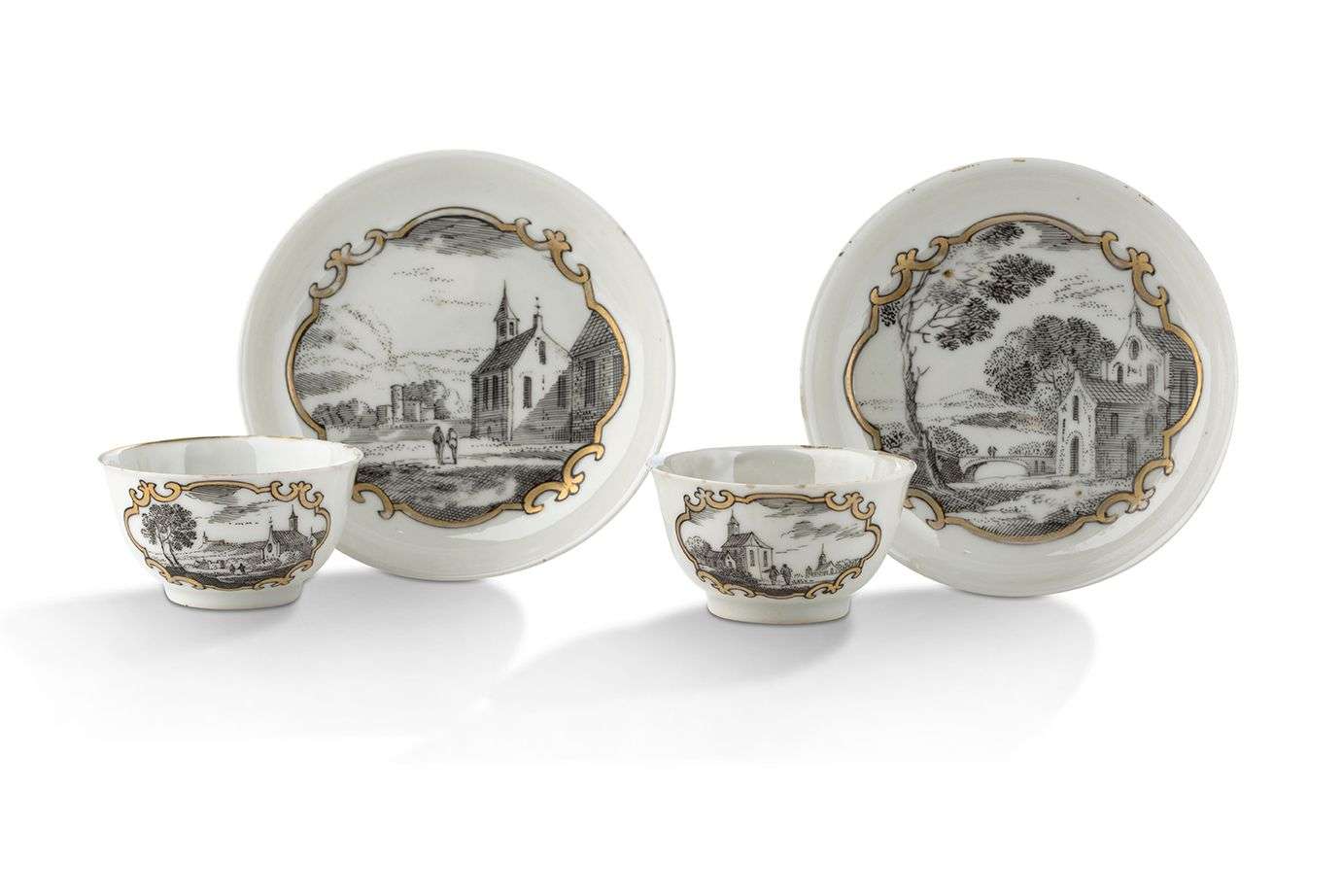 En porcelaine décorée en grisaille et rehauts d'or de vues d'architectures européennes dans des cartouches mouvementés.