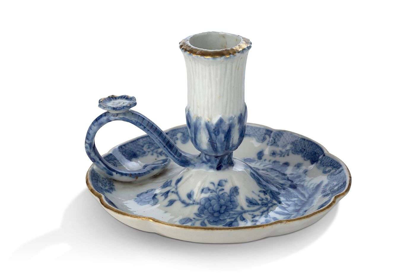 En porcelaine bleu-blanc et rehauts d'or de forme polylobée décoré d'un oiseau parmi les fleurs. La bobèche et la prise à l'imitation d'un bourgeon et sa tige.