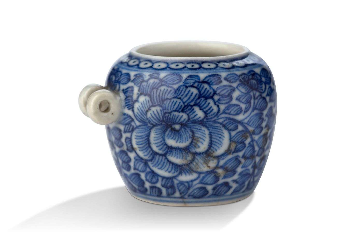 En porcelaine bleu-blanc à décor de pivoines et feuillages. La base avec une étiquette de la collection Reginald Howard Reed Palmer (1898 - 1970) n°518.