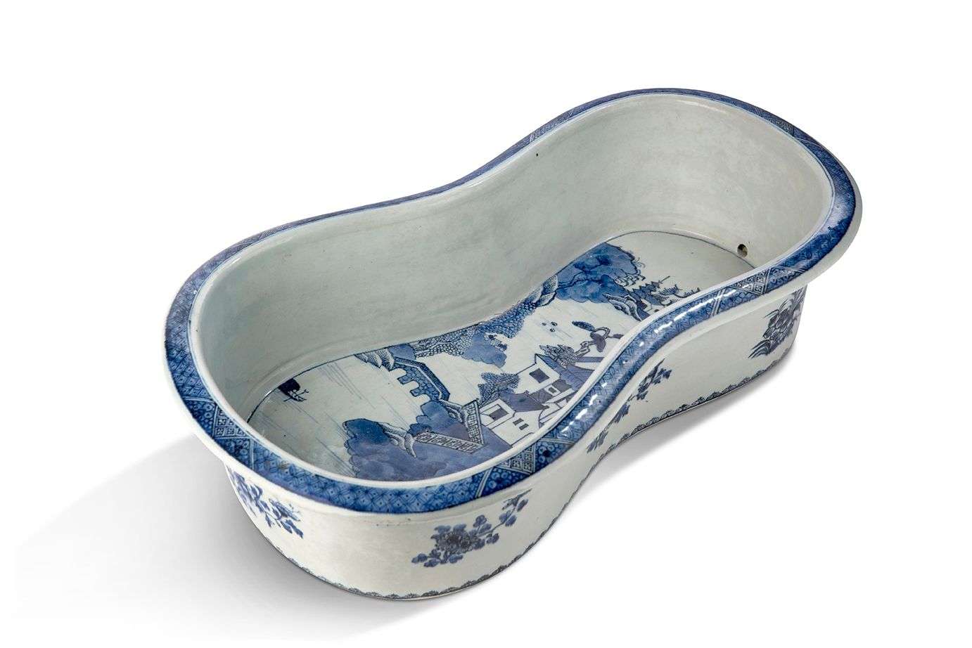 En porcelaine bleu-blanc de forme violonnée à décor de tiges fleuries et frises géométriques. L'intérieur décoré d'un paysage lacustre ponctué de pavillons.