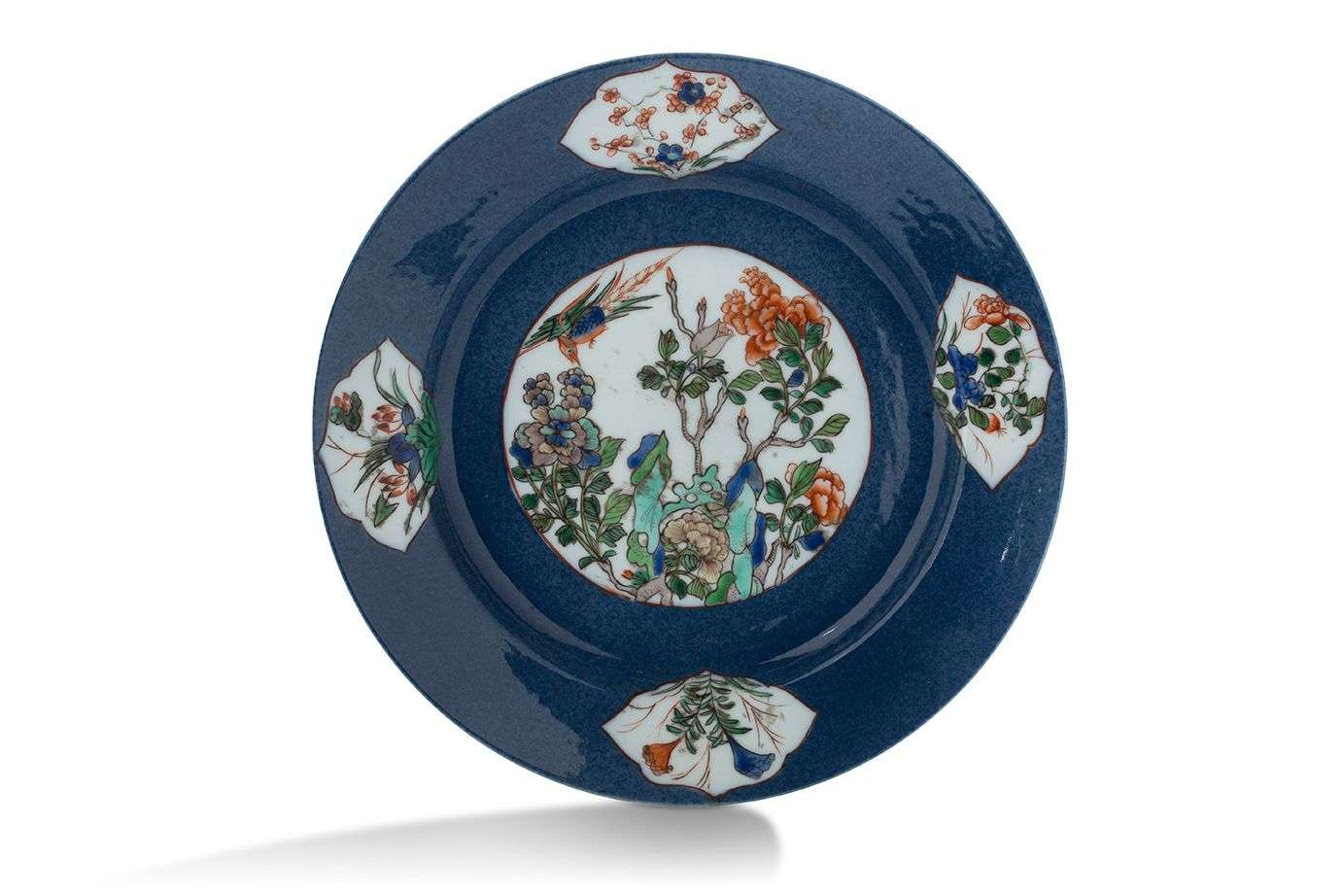 En porcelaine à fond bleu poudré et réserves aux émaux de la famille verte décoré d'oiseau parmi les fleurs.