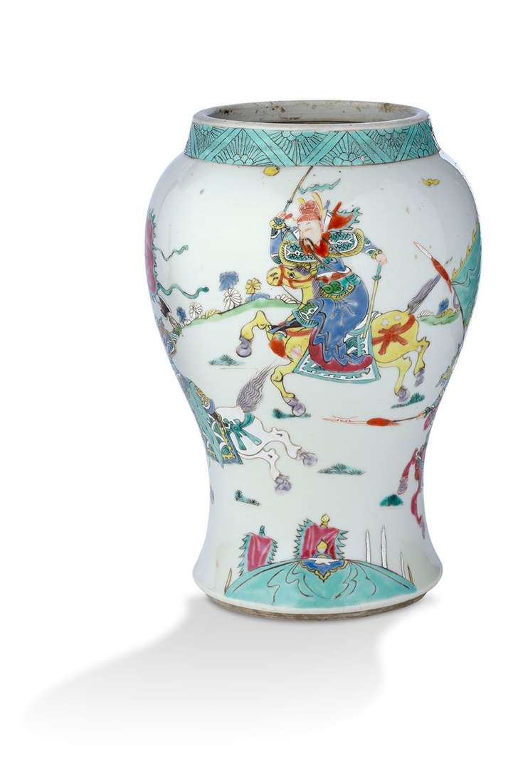 En porcelaine aux émaux de la famille rose à décor de guerriers et cavaliers en arme.