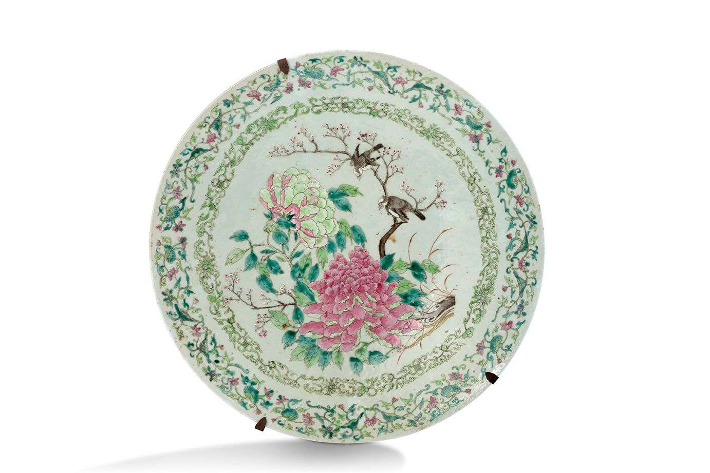En porcelaine aux émaux de la famille rose à décor d'oiseaux parmi les pivoines et les prunus en fleurs. L'aile ornée de frises de rinceaux de lotus. La base avec une marque Qianlong à six caractères en kaishu en rouge-de-fer.