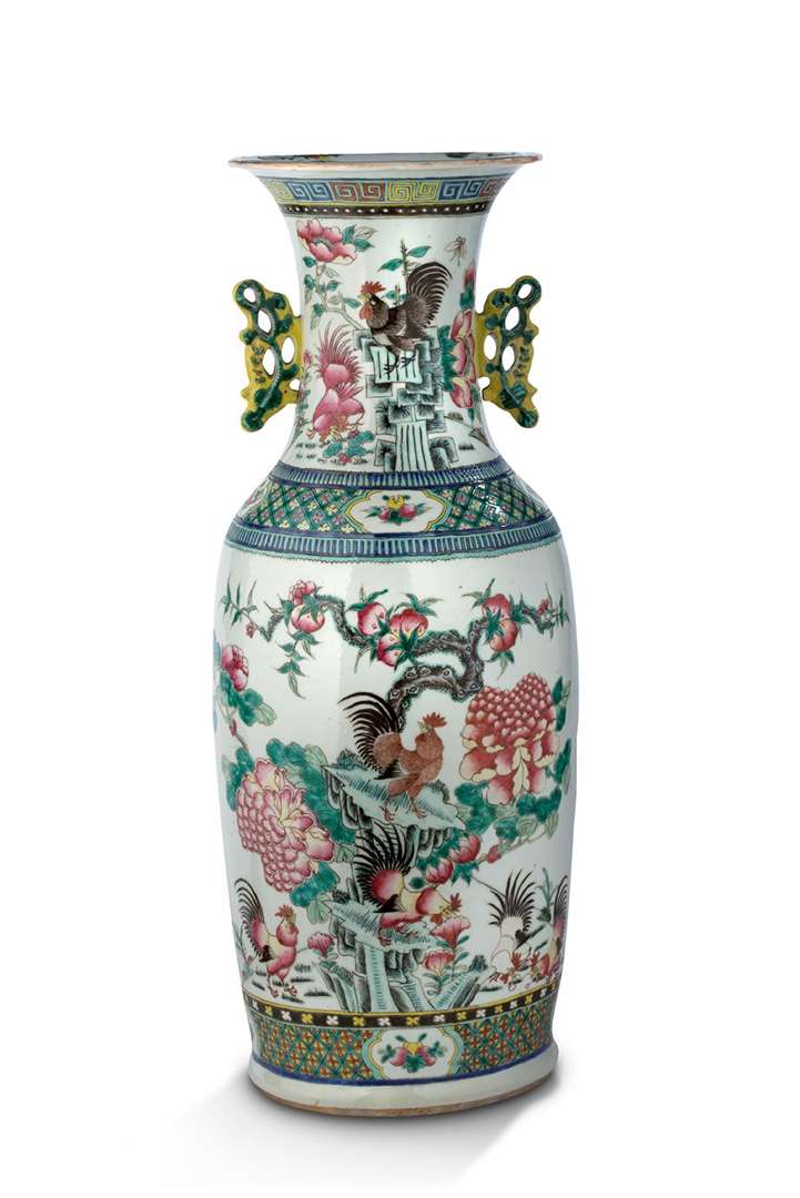 En porcelaine aux émaux de la famille rose décorés de coqs parmi les pivoines et les rochers, l'autre face avec des immortels taoïstes célébrant l'anniversaire de Xiwangmu.