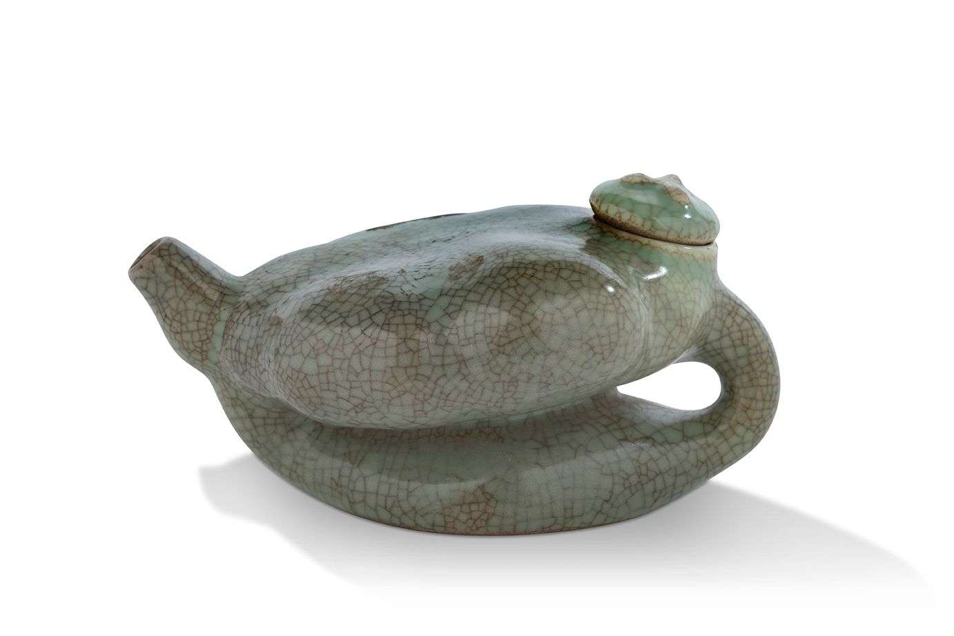 Compte-goutte en porcelaine à couverte craquelée céladon imitant la forme d'une plante aquatique.