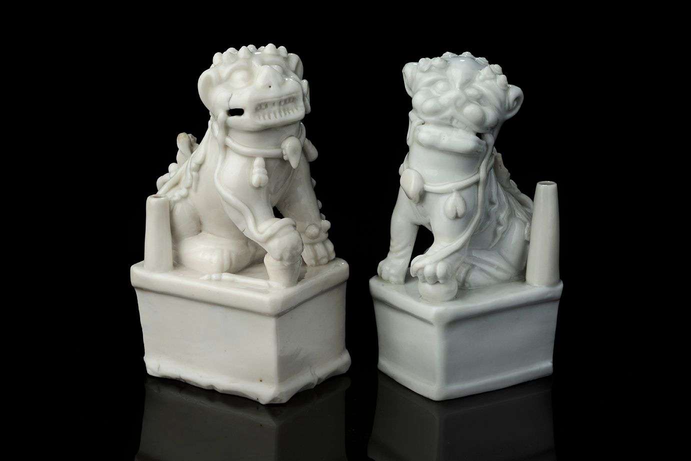 Paire de lions bouddhiques porte-encens en « Blanc-de-Chine », chacun assis sur un haut piédestal, tenant une balle de brocart sous la patte et un ruban dans la gueule, le porte-encens placé à l'arrière.