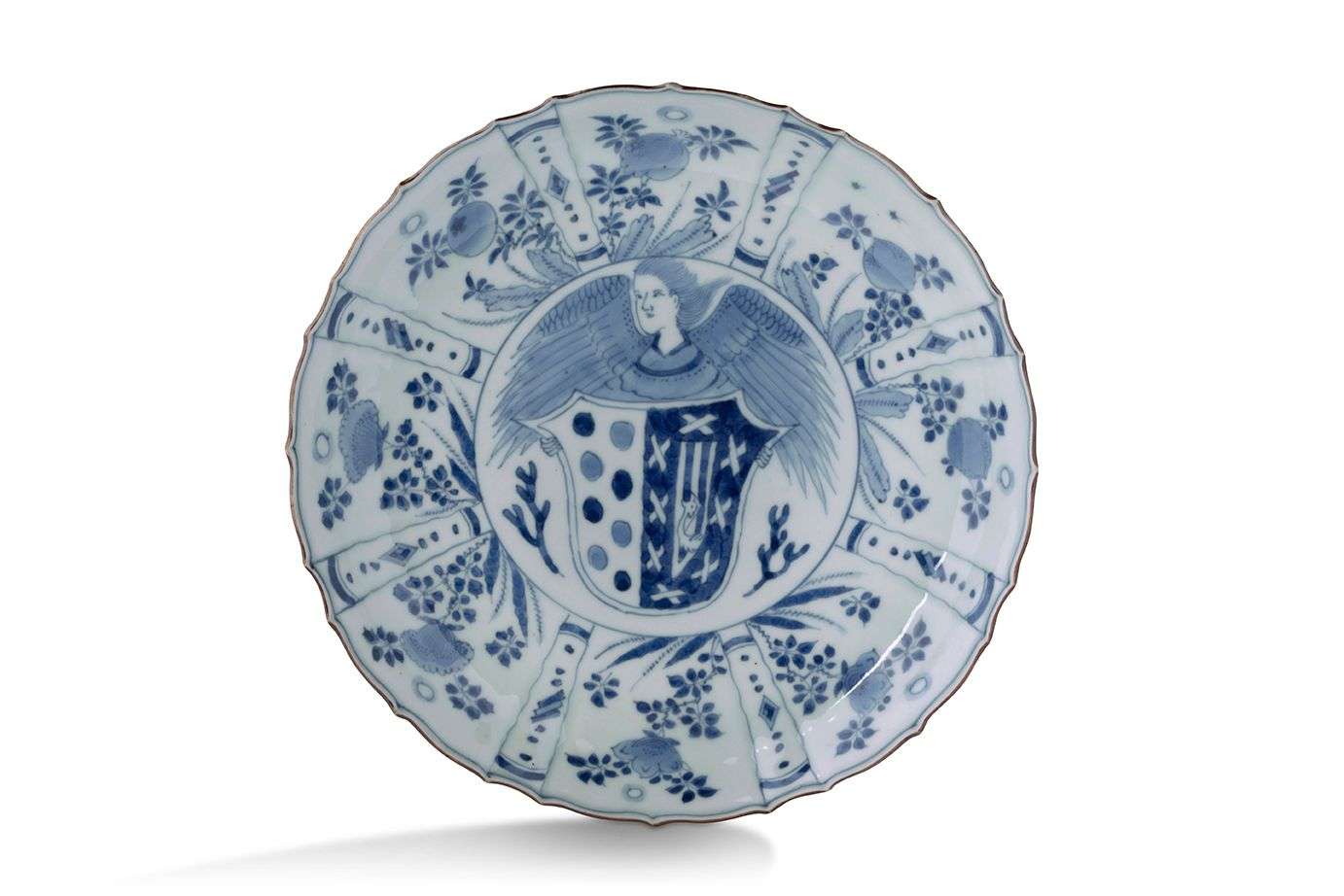 En porcelaine bleu-blanc décoré au centre d'un ange en buste tenant un bouclier armorié. L'aile ornée de panneaux de fleurs et joyaux alternés dans le style des porcelaines «kraak». La lèvre soulignée d'un émail à l'oxyde de fer dit «Fuchibeni».