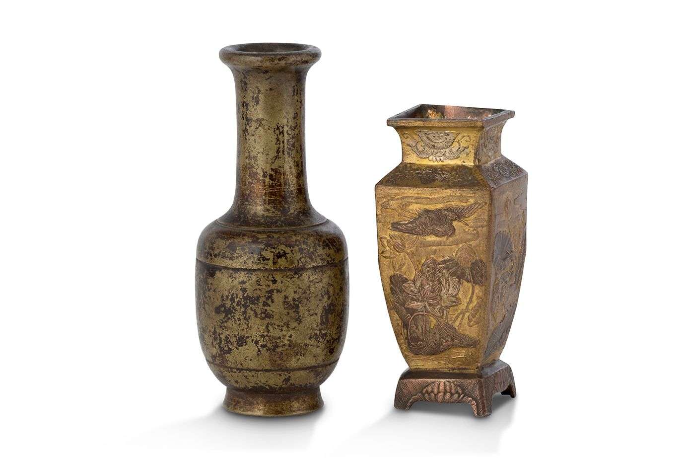 Comprenant un petit vase balustre quadrangulaire en bronze moulé à décor de grues parmi les lotus et un petit vase bouteille en bronze patiné.