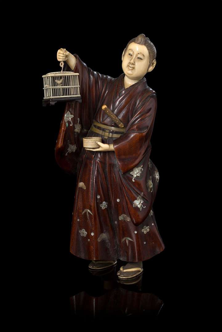 En ivoire et bois sculpté figurant un jeune samouraï tenant une cage à oiseau, vêtu d'un élégant costume rehaussé d'incrustations de nacre. Une signature «Miyao» dans un cartouche en nacre sur le côté droit du hakama du personnage.