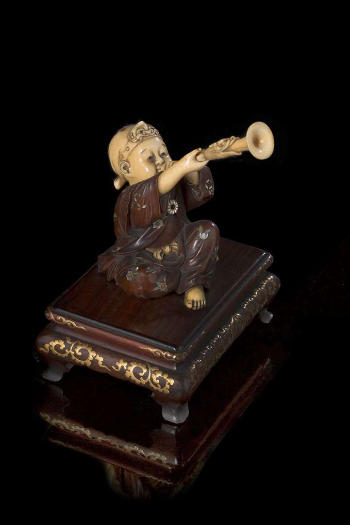 En ivoire et bois sculpté figurant un karako jouant de la trompette, vêtu d'un costume rehaussé d'incrustations de nacre.