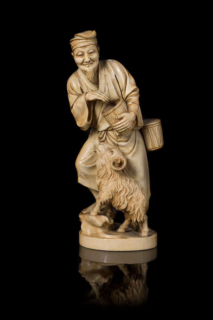 En ivoire sculpté figurant un vieil homme nourrissant une chèvre. La base signée.