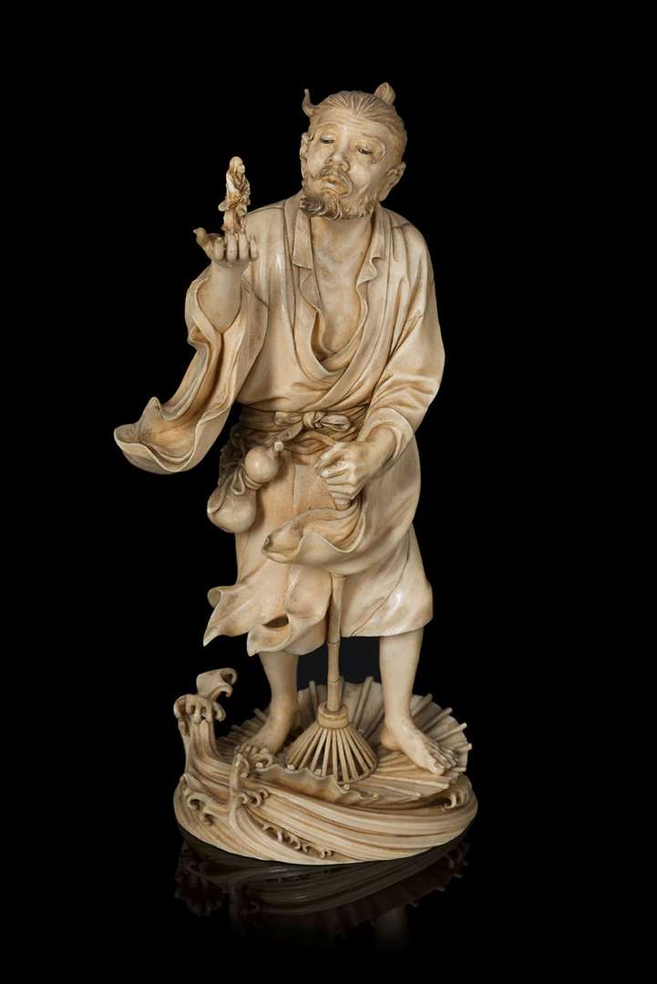 En ivoire sculpté figurant Tekkai Sennin, debout sur une ombrelle retournée, exhalant son esprit par la bouche, lequel prend la forme d'un petit personnage qu'il tient dans la main.