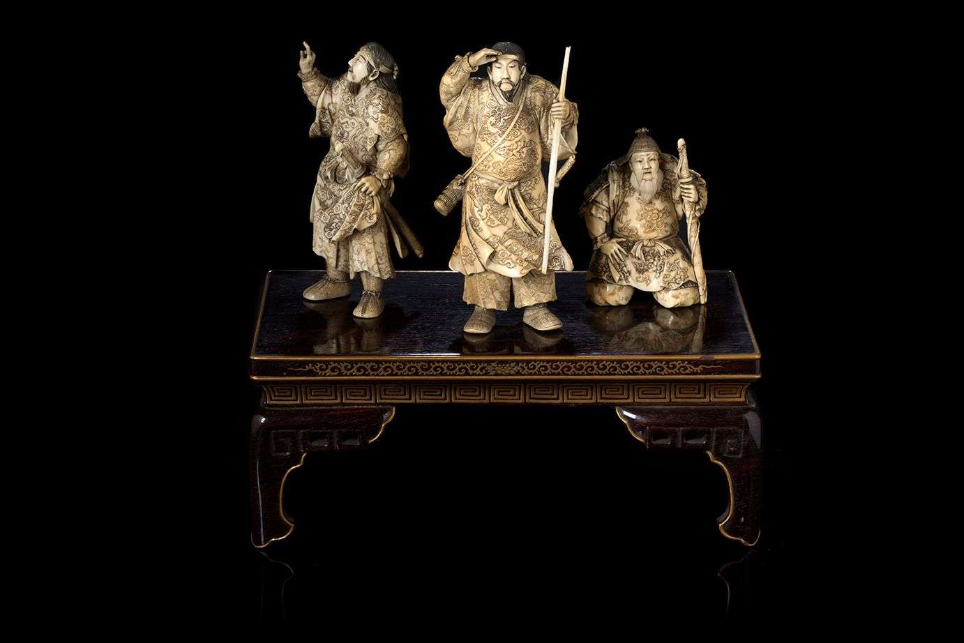 En ivoire sculpté représentant trois guerriers scrutant l'horizon, possiblement l'empereur Jimmu et ses frères. L'ensemble reposant sur un socle en bois décoré de grecques et rinceaux en laque hiramaki-e.