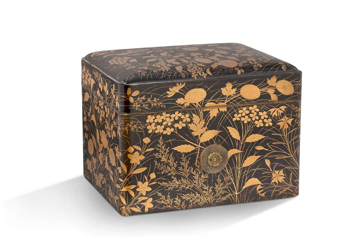 Rectangulaire à côtés arrondis décorée en laque hiramaki-e sur fond noir de fleurs d'automne (chrysanthèmes, campanules, susuki, oeillets, lespédèzes...). Les côtés de la boîte flanqués de deux médaillons en métal figurant des fleurs de cerisier.