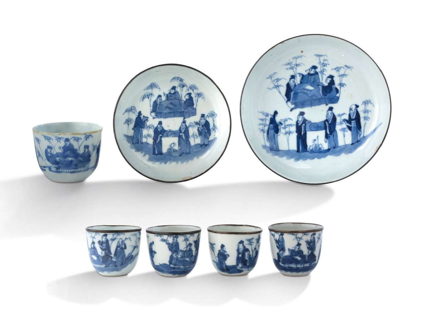 En porcelaine bleu-blanc composé d'un grand et d'un petit plateaux, d'une grande coupe et de quatre petites coupes. L'ensemble à décor d'une composition mettant en scène les Sept Sages de la forêt de bambous.