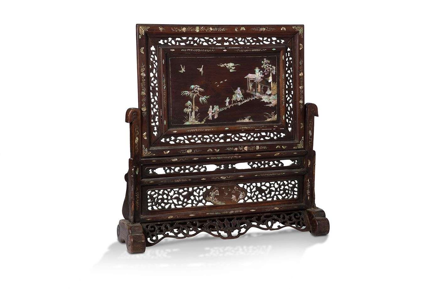 En bois naturel et incrustations de nacre figurant un lettré cheminant vers un pavillon.