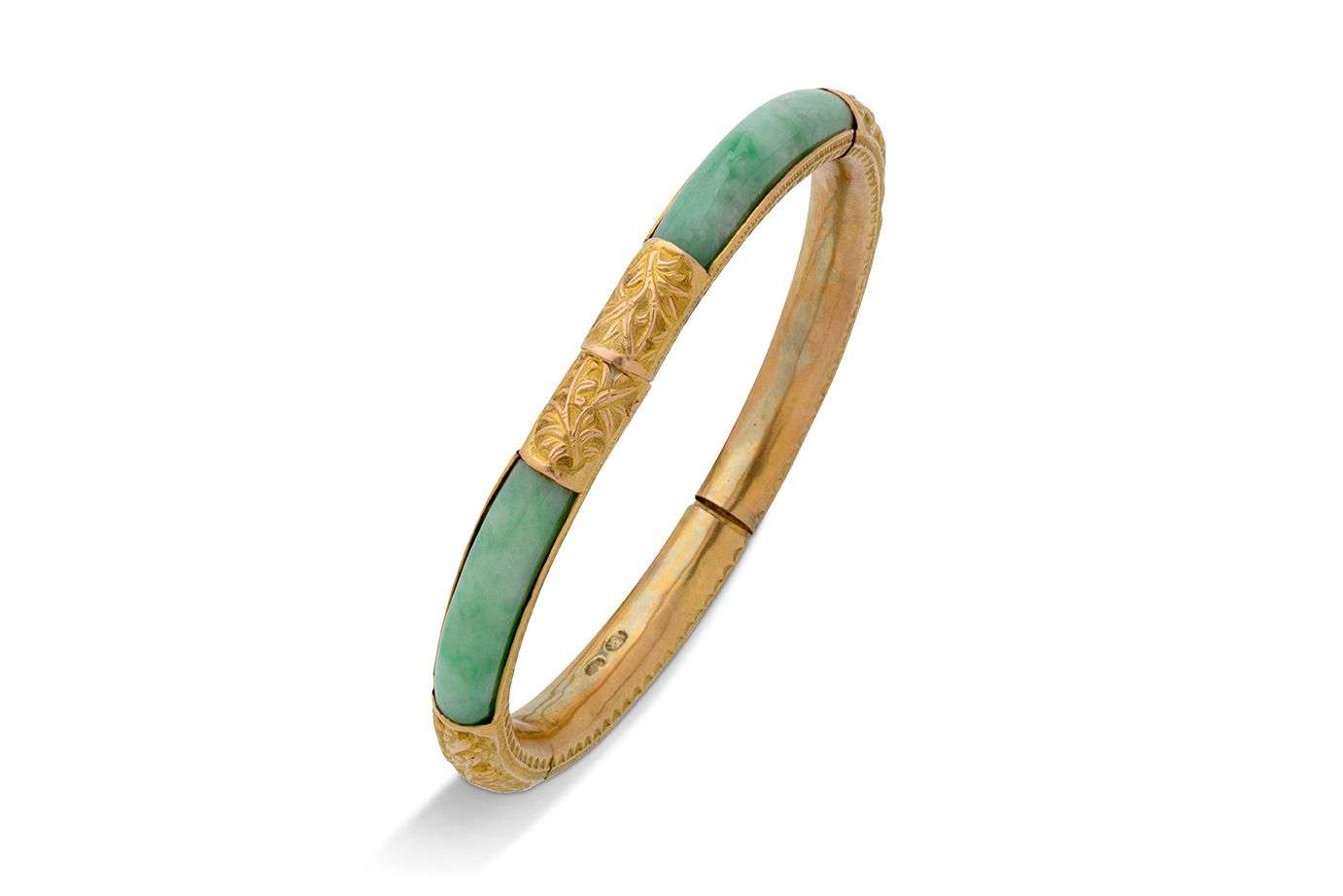 Bracelet jonc articulé en jade et or (18k), la monture ciselée de dragons et bambous.