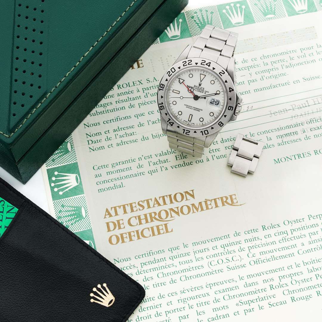Avec : un écrin, certificat de garantie en date du 30.08.1991, une garantie de service Rolex en date du 29.07.2009, les factures correspondantes, un livret, pochette simili cuir noir et deux maillons supplémentaires