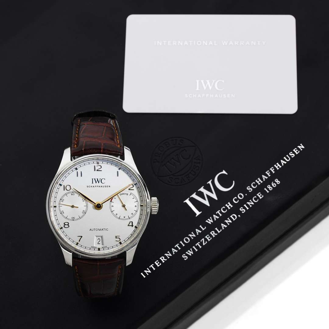 A stainless-steel automatic wristwatch by IWC with 7 days power reserve, a warranty card and a presentation case