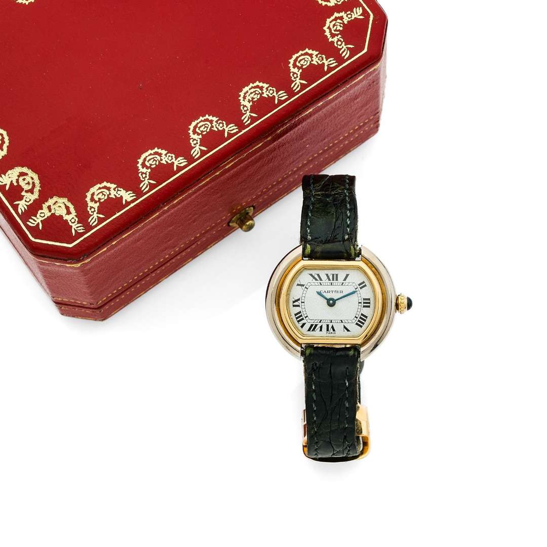 A 18k yellow and white gold lady's wristwatch by Cartier with gold deployant clasp with a presentation case signed Must de Cartier