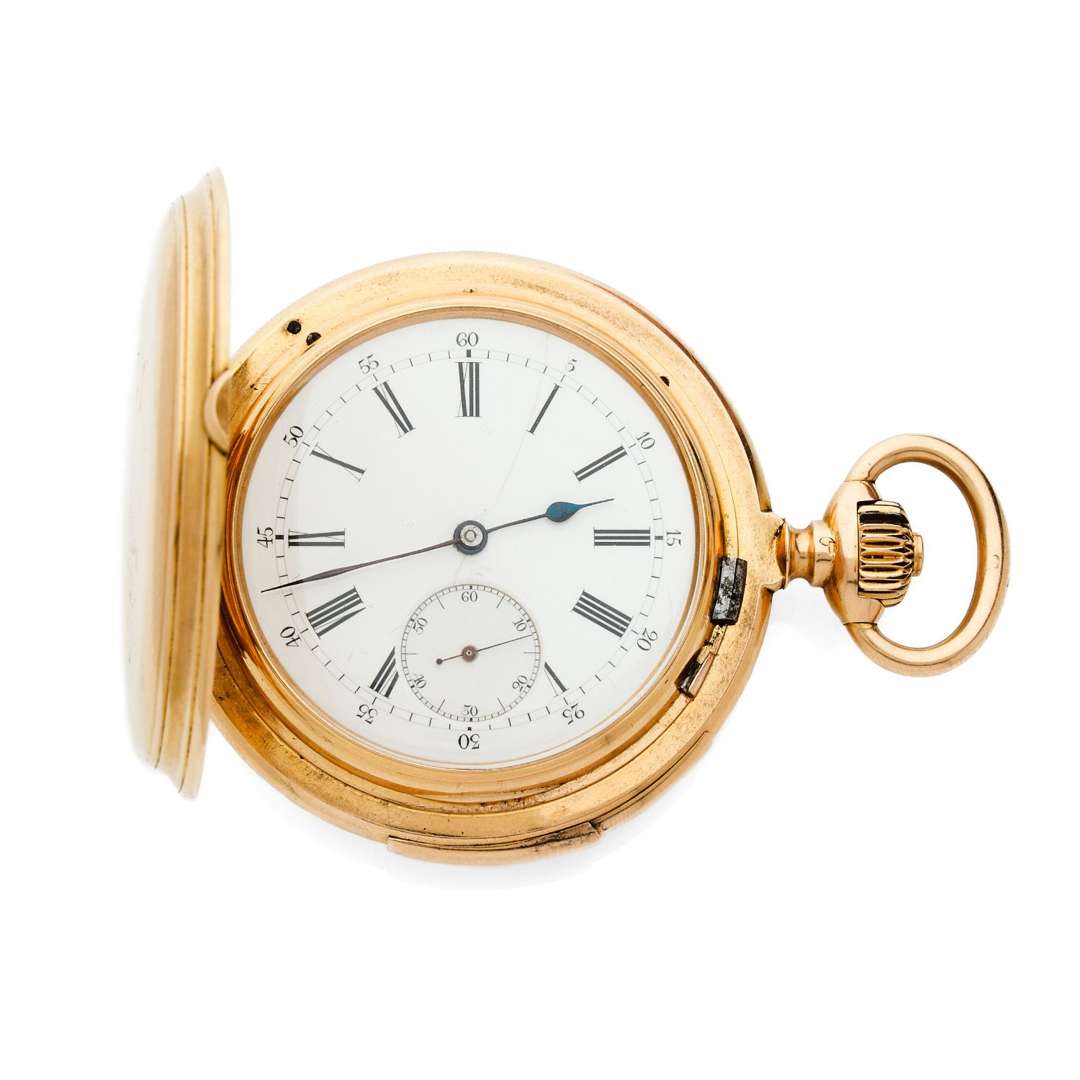Cadran : émail blanc avec chiffres romains pour les heures et arabes pour les minutes, minuterie chemin de fer, petite trotteuse (fêle)