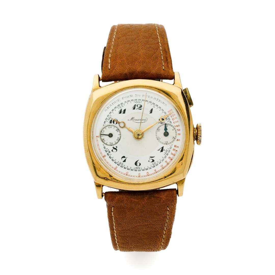 A 18k yellow gold single button chronograph by Minerva with enamel dial and pulsometer scale