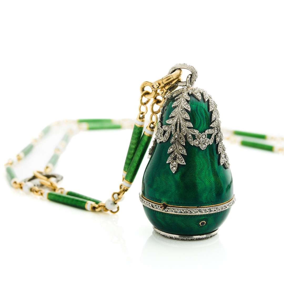 Avec : une chaîne reprenant la même décoration en émail vert translucide et guilloché avec des perles intercalées