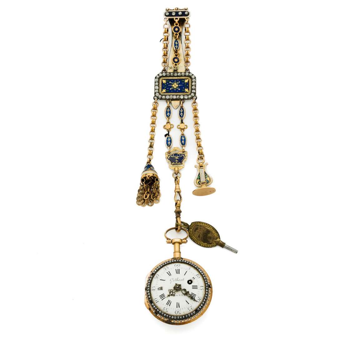 Montre de poche avec sonnerie à toc en or et émail accompagnée d'une châtelaine émaillée avec des breloques