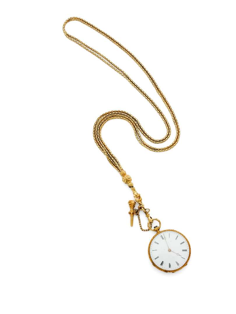 Montre de col en or 18k (750) avec une chaîne et clef de remontage