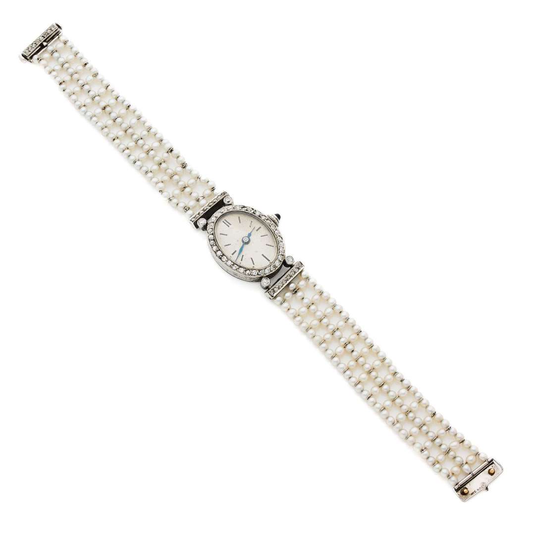 A platinum, gold and diamond manual winding lady's Art Deco wristwatch with pearls bracelet