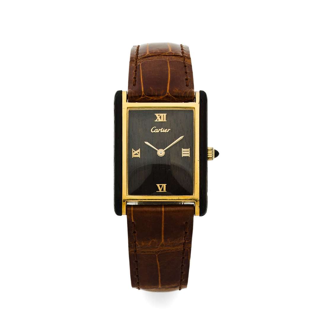 A gold plated and wooden manual winding wristwatch with after sale Cartier service literature