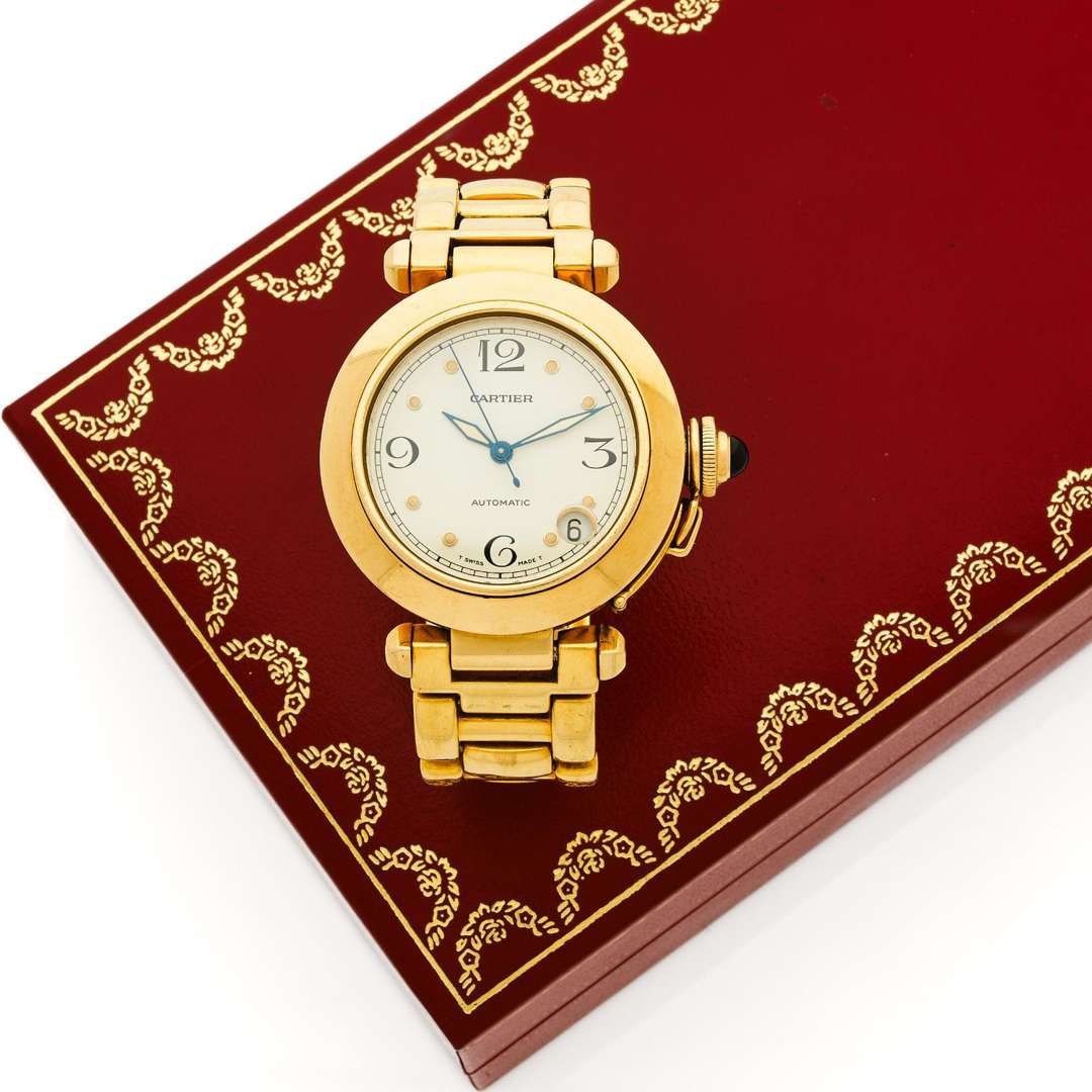 A 18k yellow gold automatic wristwatch by Cartier with gold bracelet and double deployant clap signed, original certificate
