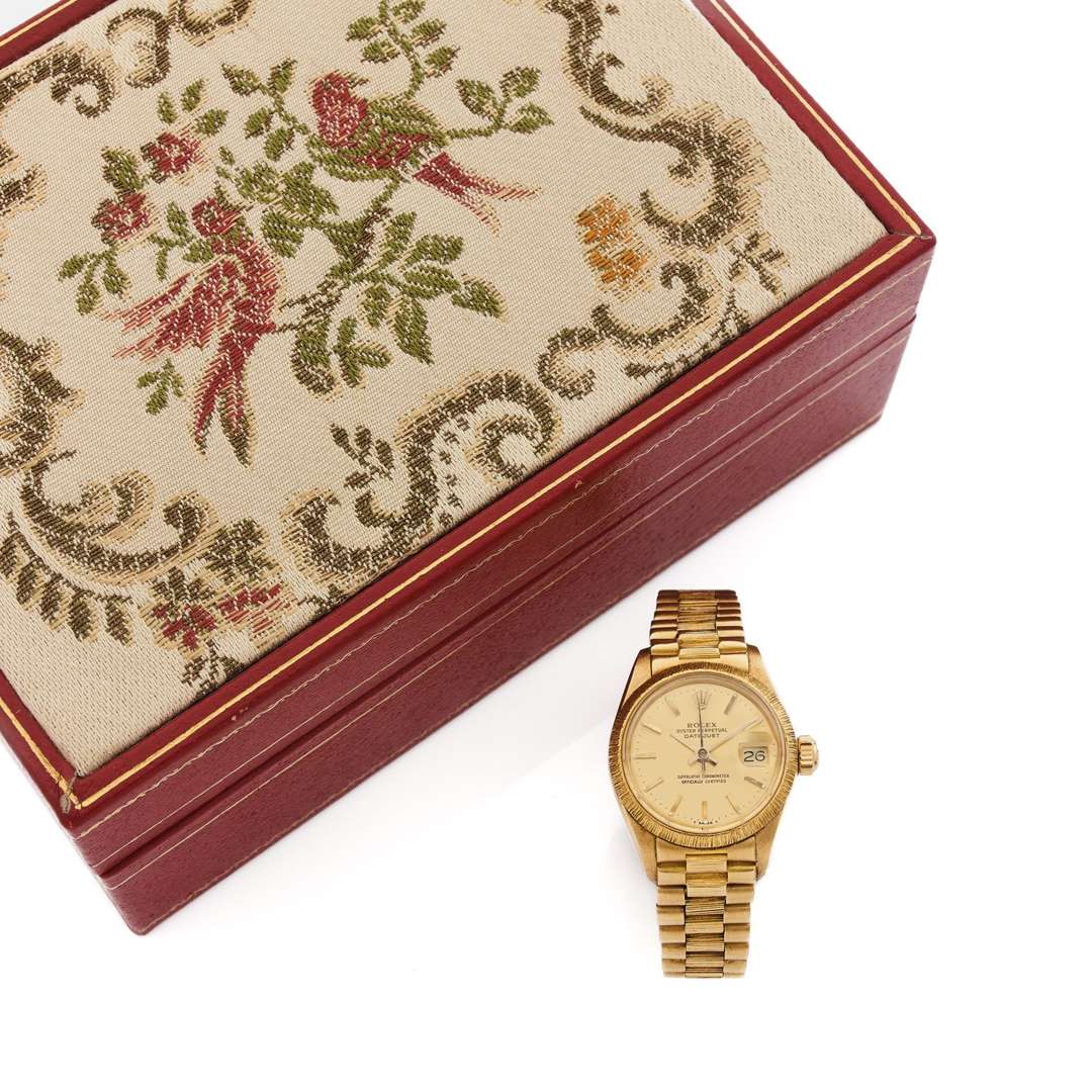 A 18k yellow gold automatic lady's wristwatch signed by Rolex, with a presentation case and a service Rolex invoice dated 2003