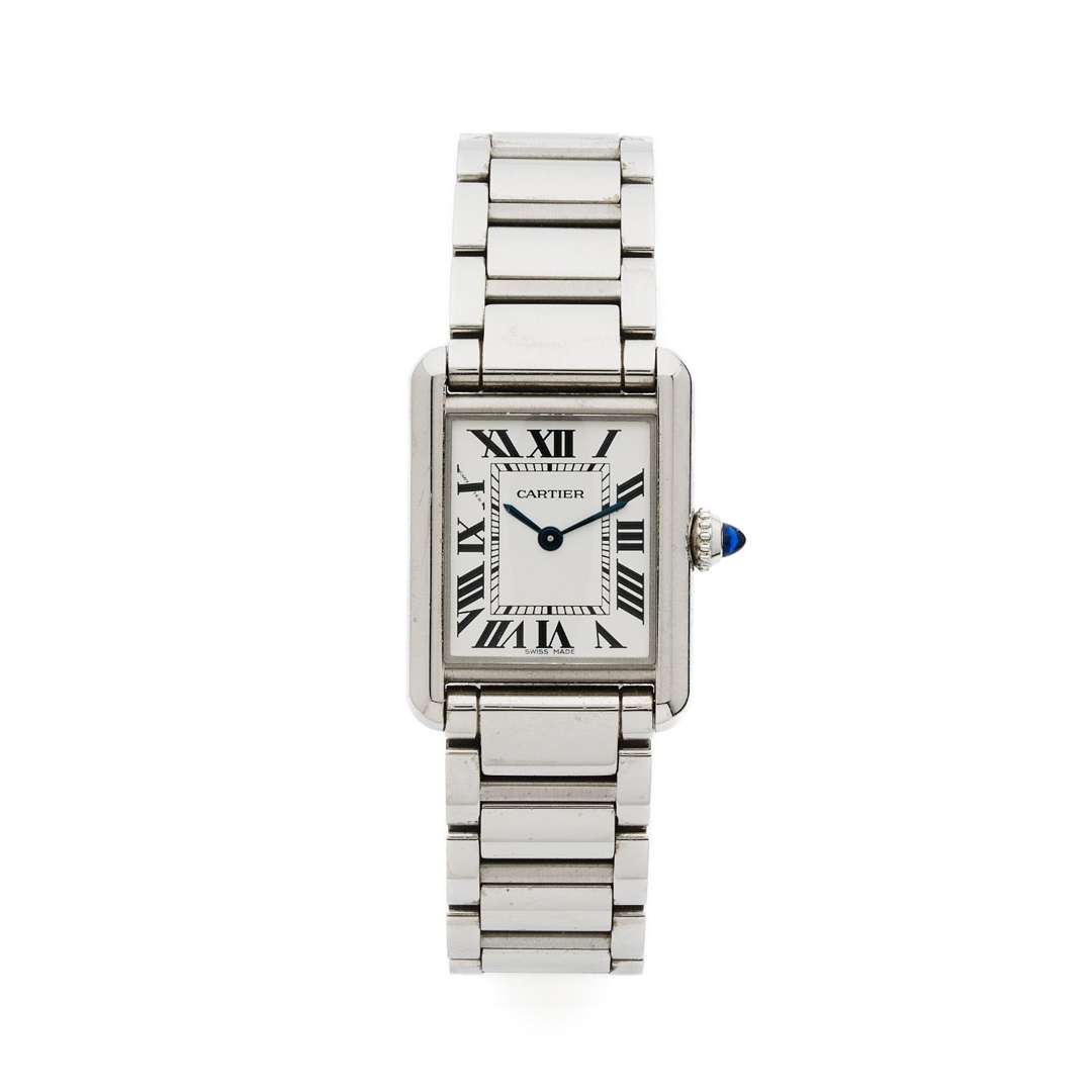 A stainless-steel mid-size quartz wristwatch by Cartier with stainless steel bracelet