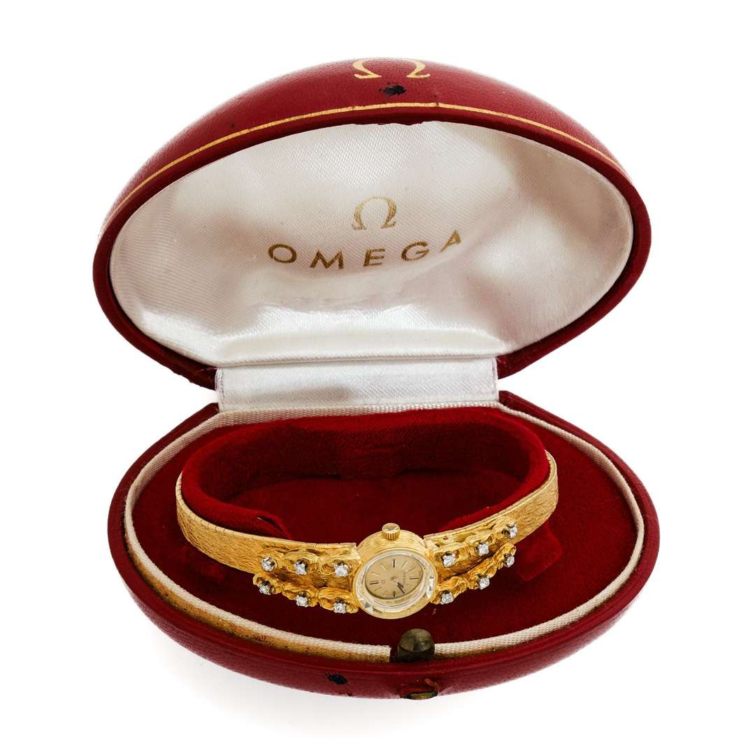 A 18k yellow gold and diamond manual winding lady's wristwatch by Omega with later yellow gold bracelet