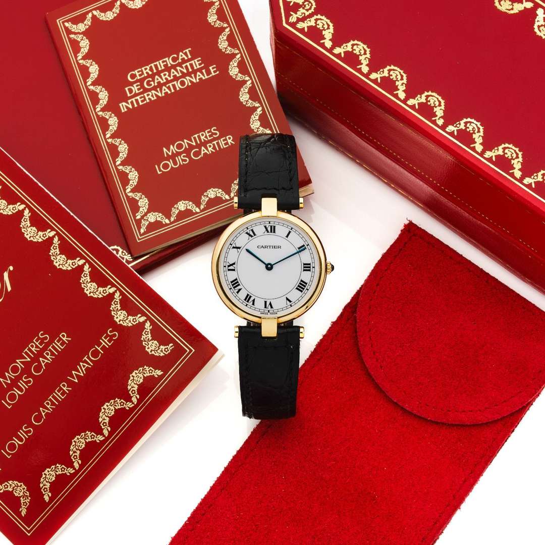 A 18k yellow gold wristwatch by Cartier with a presentation case, service pouch and leaflets with certificate dated 19.07.90
