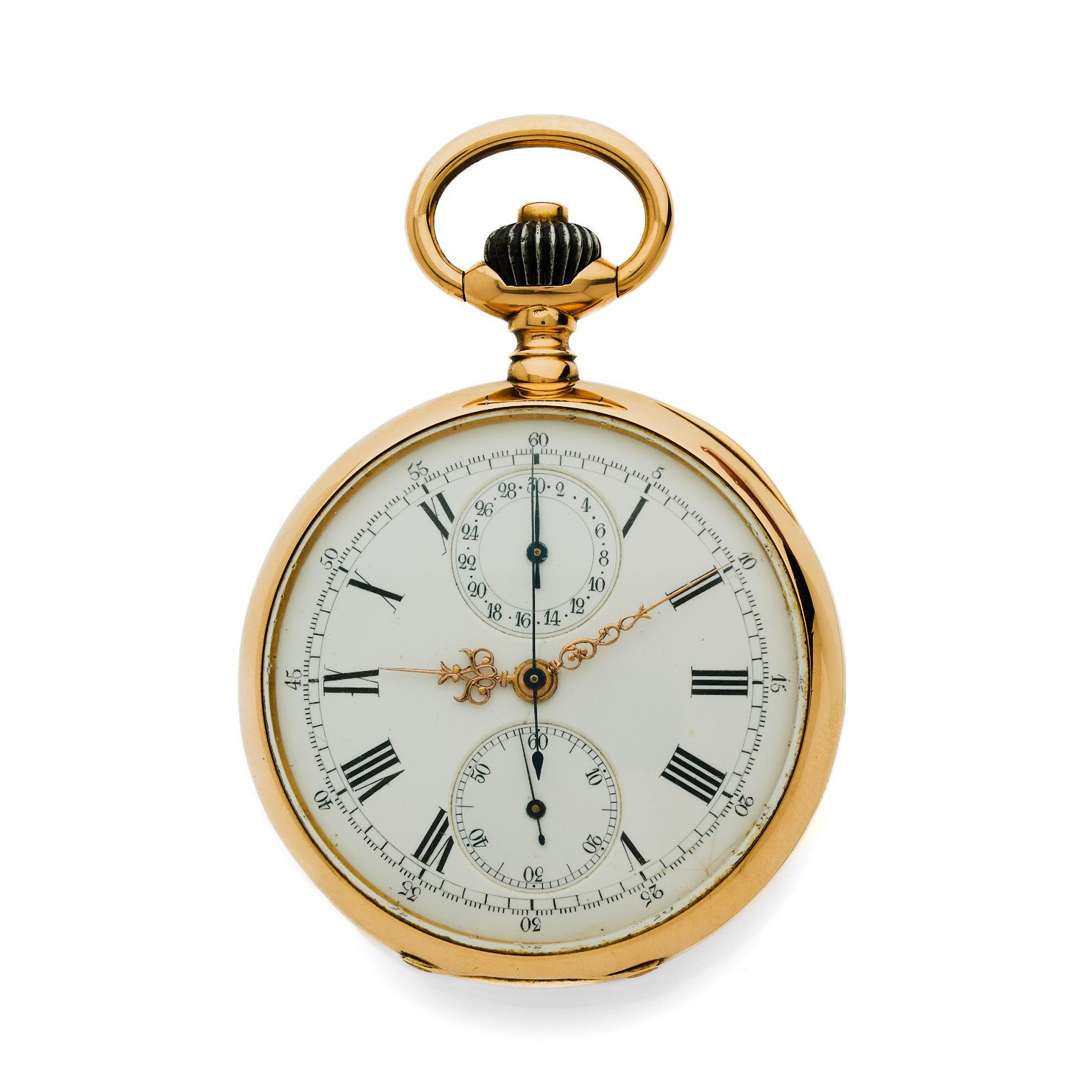 A 18k gold keyless pocket watch with chronograph and 30-minute register