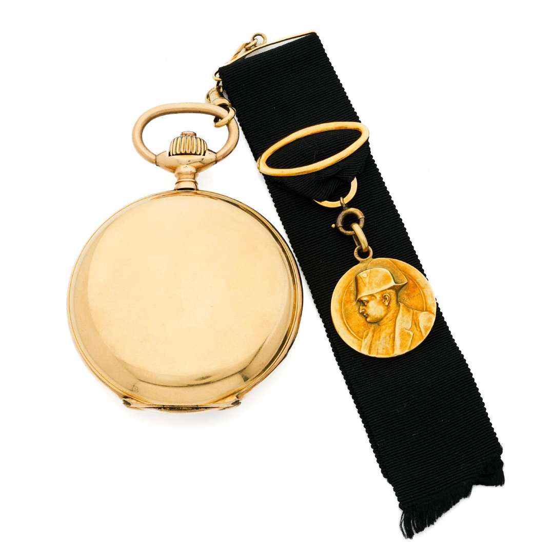 Accompagnée d'une châtelaine en or 18k (750) et satin retenant une médaille à l'effigie de Napoléon Bonaparte à Sainte Helène ( poids brut : 17,98 g.)