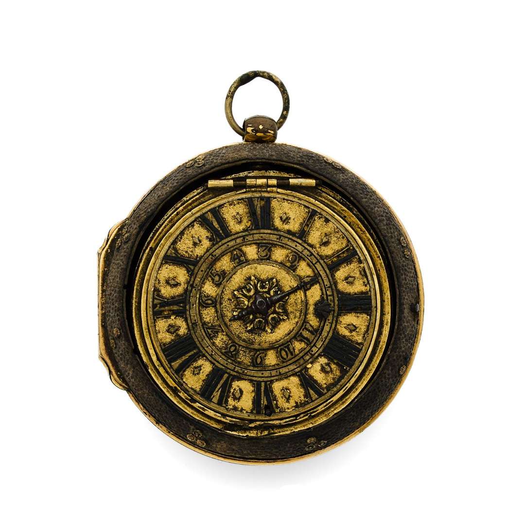 Boîtier : métal doré ciselé et repercé, manque la lunette et le boîtier de protection externe recouvert de cuir est postérieur, non d'origine
