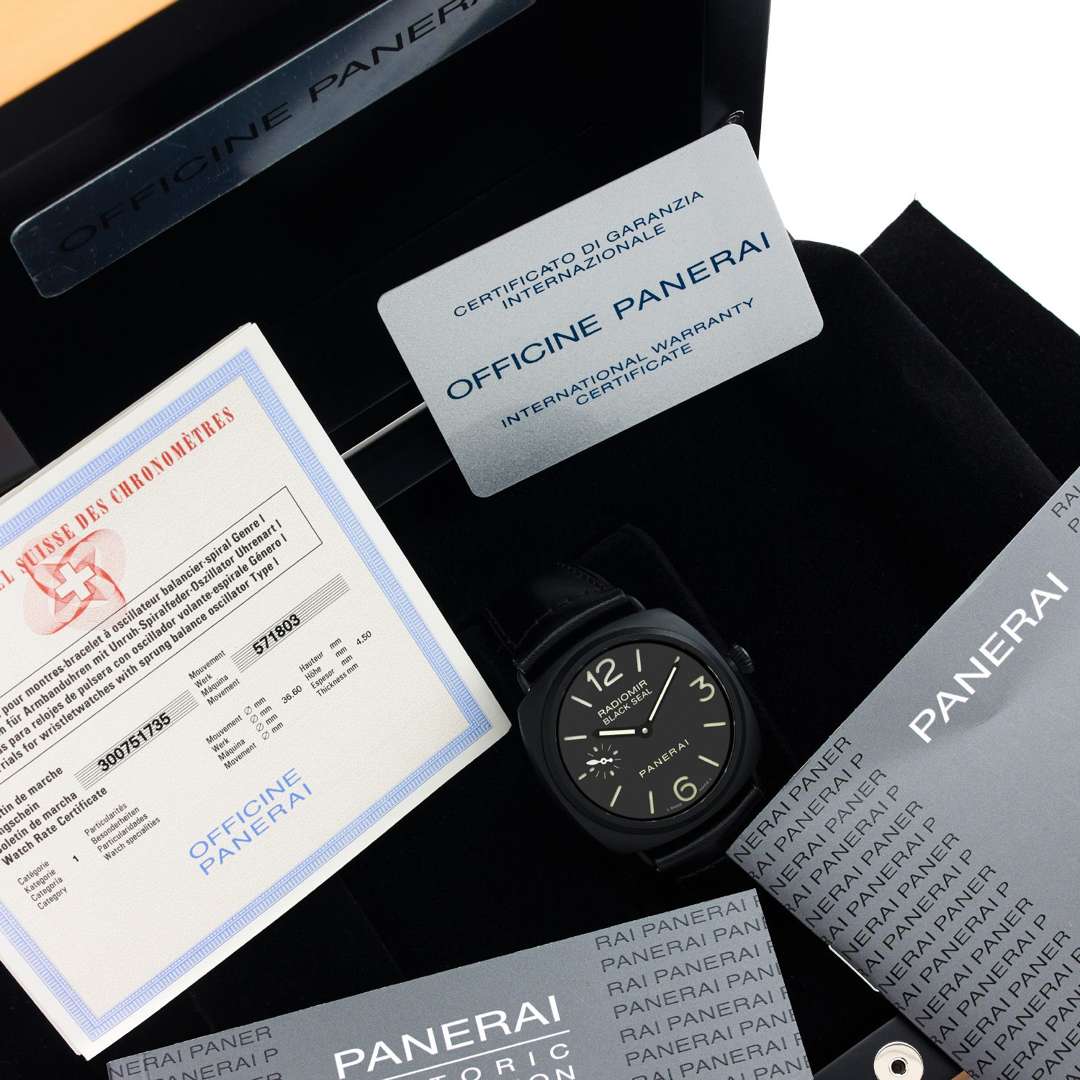 A black ceramic and stainless-steel manual winding wristwatch by Panerai, full set with original box, leaflets, COSC and original certificate