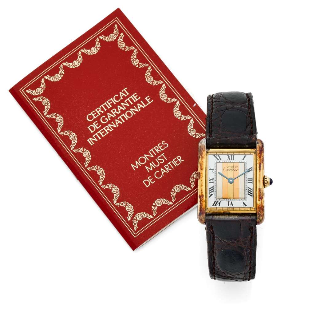 A silver gilted lady's quartz wristwatch by Cartier with warranty card