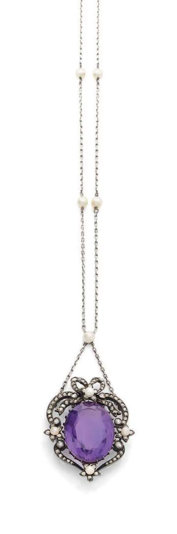 Améthyste ovale, perles supposées fines et diamants taille rose