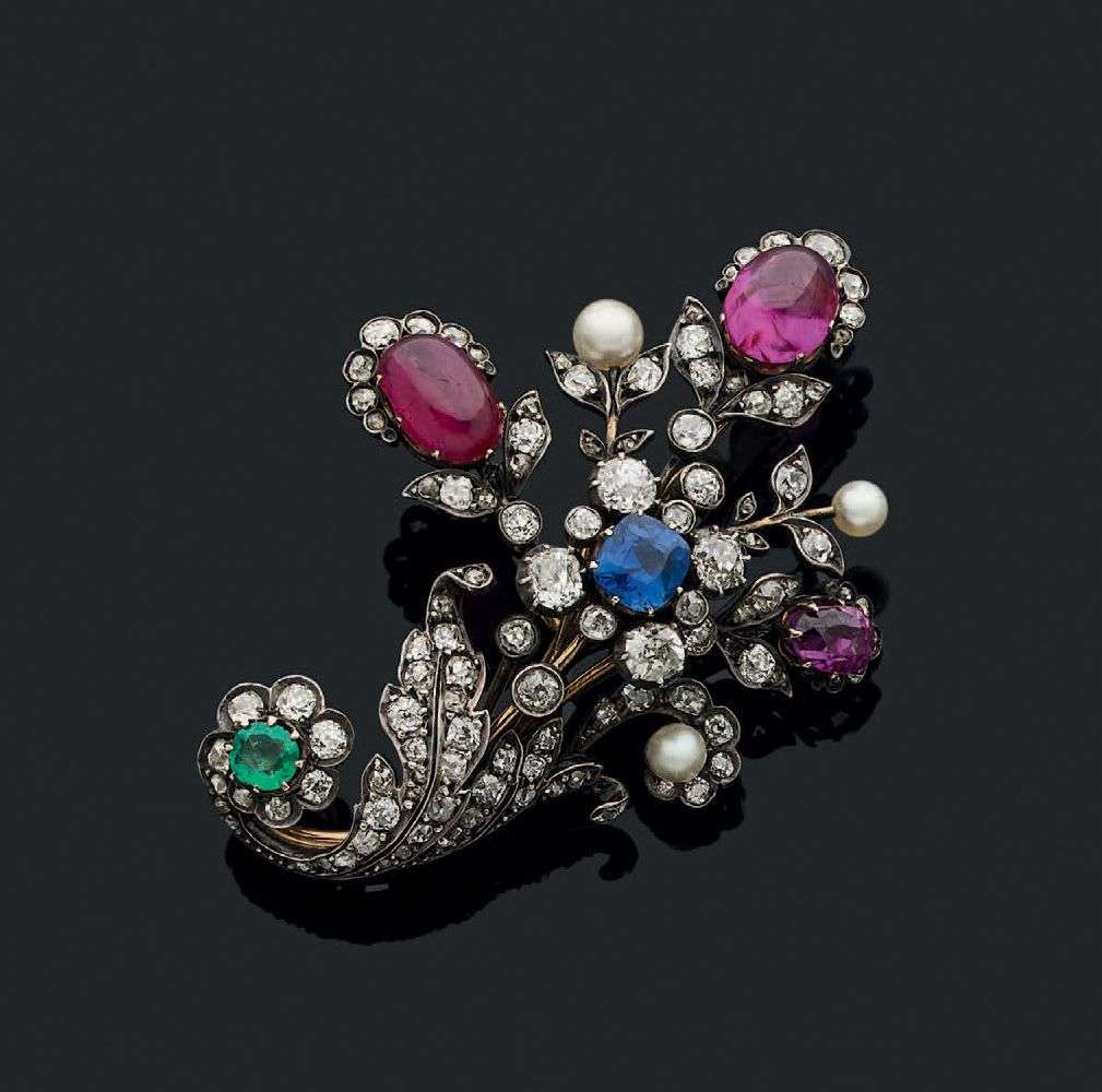 Rubis, saphir, émeraude, diamants taille ancienne, perles supposées fines, non testées