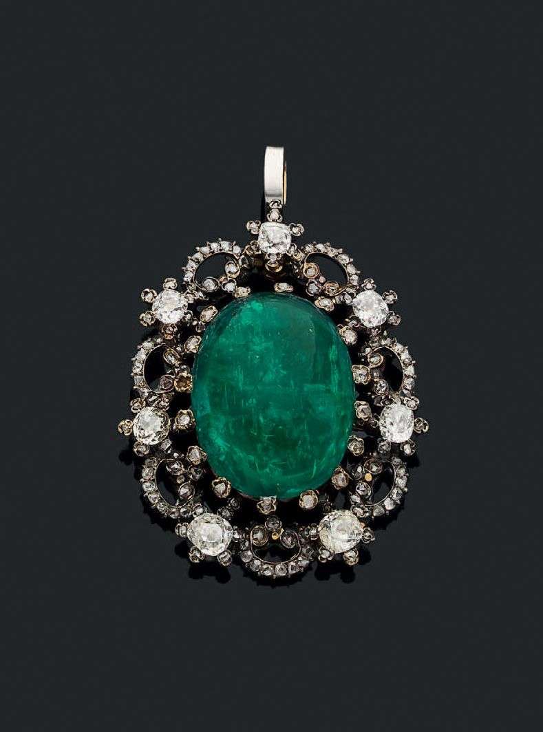 Cabochon d'émeraude, diamants taille ancienne et taille rose