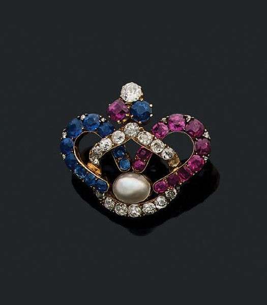 A ruby, sapphire, diamond, pearl and gold brooch