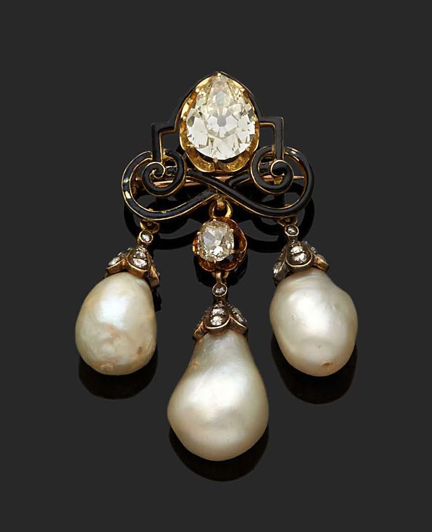 An enamel, diamond, natural pearl and gold brooch-pendant, report