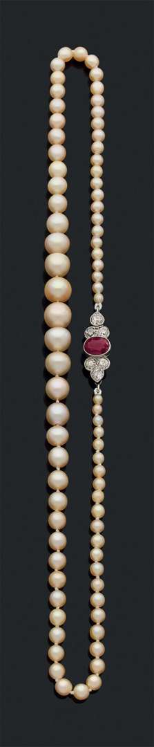 A natural pearl, ruby, diamond and gold necklace, report