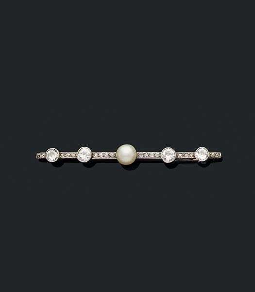 A natural pearl, not tested, diamond, platinum and gold brooch