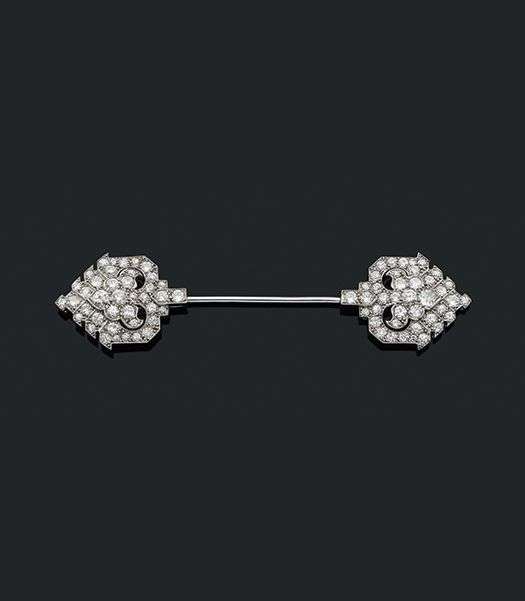 Cette épingle à jabot, entièrement pavée de diamants, évoque les influences orientales dans le répertoire stylistique de la maison Cartier. Le motif répété de façon symétrique prend certainement source dans les motifs de tapis persans.